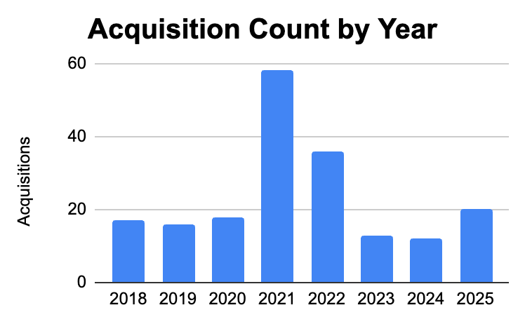 This sentiment changed in 2025. That year, a major driver was large fintech companies aggressively entering the acquisition arena. This includes Coinbase’s $2.9B acquisition of Deribit, Xero’s $2.5B acquisition of Melio, Ripple’s $1.25B acquisition of Hidden Road, and Door Dash’s $1.2B acquisition of SevenRooms. Traditional acquirers, such as MasterCard, Munich Re, and Verisk, all completed acquisitions north of $2B as well. For many, these were catalytic acquisitions that were fueled by record stock performance and strong cash reserves. Both the Coinbase and Ripple acquisitions also took advantage of greater regulatory clarity within crypto and trading. For others, it appears that the “bid-ask spreads” between acquirers and startups finally converged.