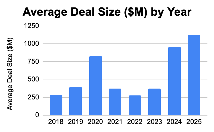 The 2025 valuations represented a 2.8x increase from our prior analysis of average M&A price. Across all years, the average large M&A deal increased to $532M.