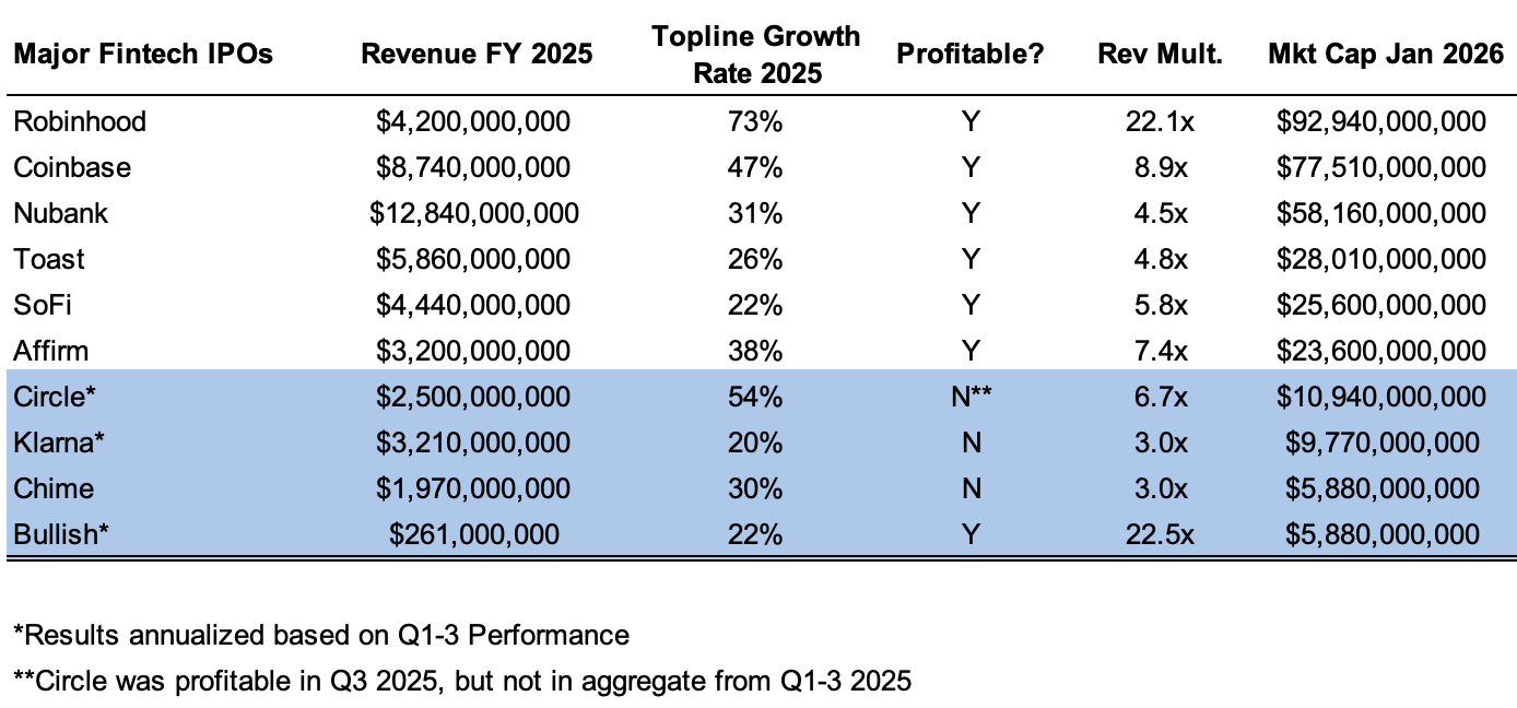 One of the outstanding questions from the last two years is whether the Racehorses of 2025 (Circle, Klarna, and Chime) will be able to retain their position. The table below outlines the Top 10 public fintech companies by market cap, with the 2025 exits highlighted in blue.